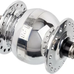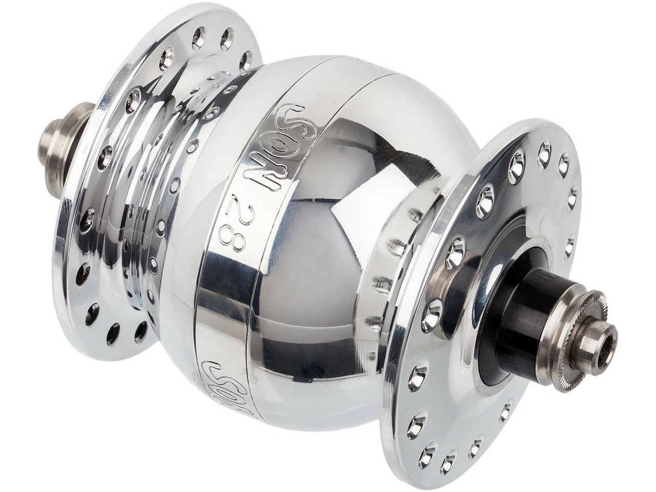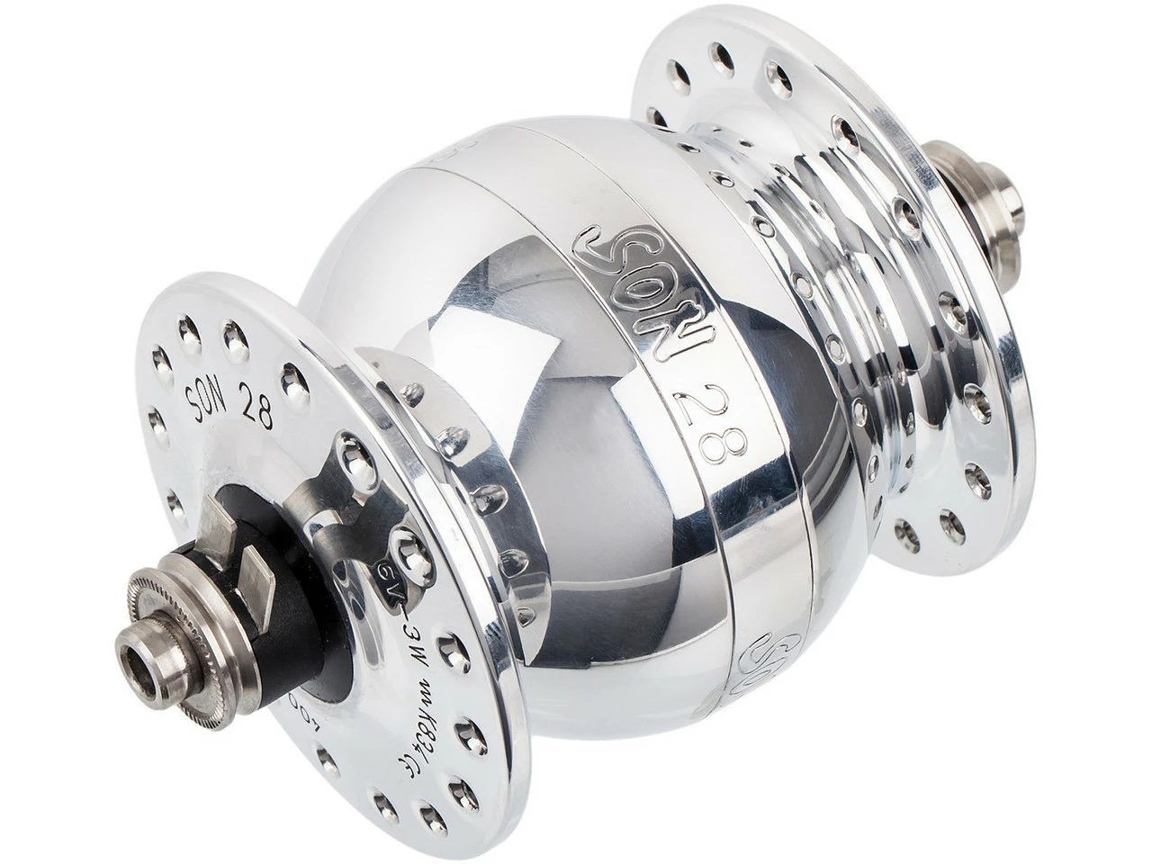 La SON 28 est une dynamo de moyeu universellement approuvée pour toutes les tailles de roue de 16″ à 29″ . Elle atteint sa puissance nominale dans une roue de 28 pouces à environ 16 km/h. Elle est donc recommandé si un niveau de lumière particulièrement élevé est requis lors d’une conduite lente ou si d’autres appareils doivent être utilisés ou leurs batteries chargées. Par rapport à son prédécesseur Son klassik, les pertes au ralenti ont pu être réduites d’environ 15 % et le poids de 140 g.